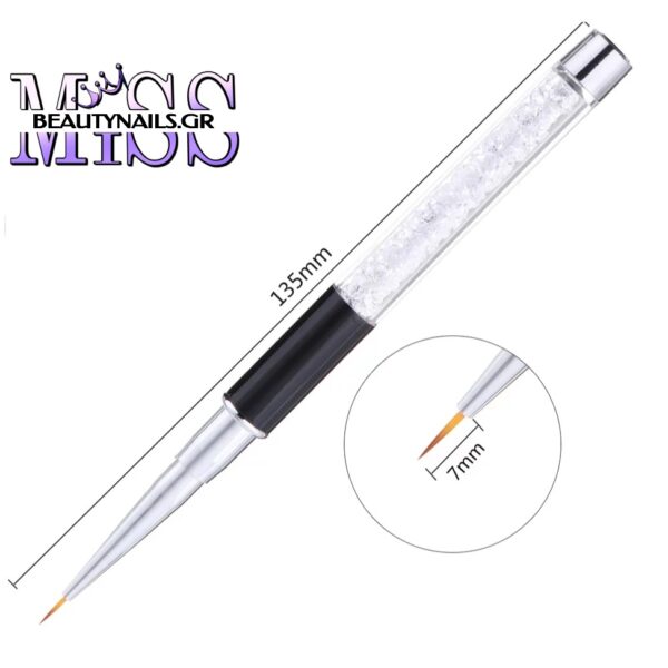 Επαγγελματικό πινέλο Nail Art 7mm. Υψηλής ποιότητας με συνθετική τρίχα. Ελαφρύ και άνετο στο χέρι. Εντυπωσιακός σχεδιασμός με λεπτομέρειες από κρύσταλλα στο πίσο μέρος. Για τον καθαρισμό των πινέλων χρησιμοποιείτε ειδικά πανάκια κυτταρίνης ή υγρομάντηλα. Το ασετόν ή παρόμοια υγρά μπορεί να αλλοιώσουν τα πλαστικά μέροι των πινέλων σας.